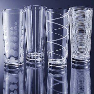 This fun new barware group from Mikasa is perfect for home entertaining or gift giving. Each of the 4 large size high ball glasses is decorated with a different etched design: swirl, horizontal pinstripes, vertical lines, and dots.